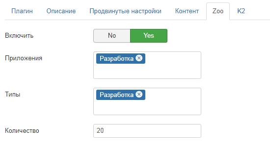 Плагин выбирает из базы материалы в соответствии с условиями, заданными в настройках. Для каждого из компонентов есть масса опций по выборке отображения материалов. Для Zoo* поддерживается неограниченное количество приложений и типов, которые можно выбрать в настройках. Никаких id элементов, только настройка из административной части плагина или Zoo.